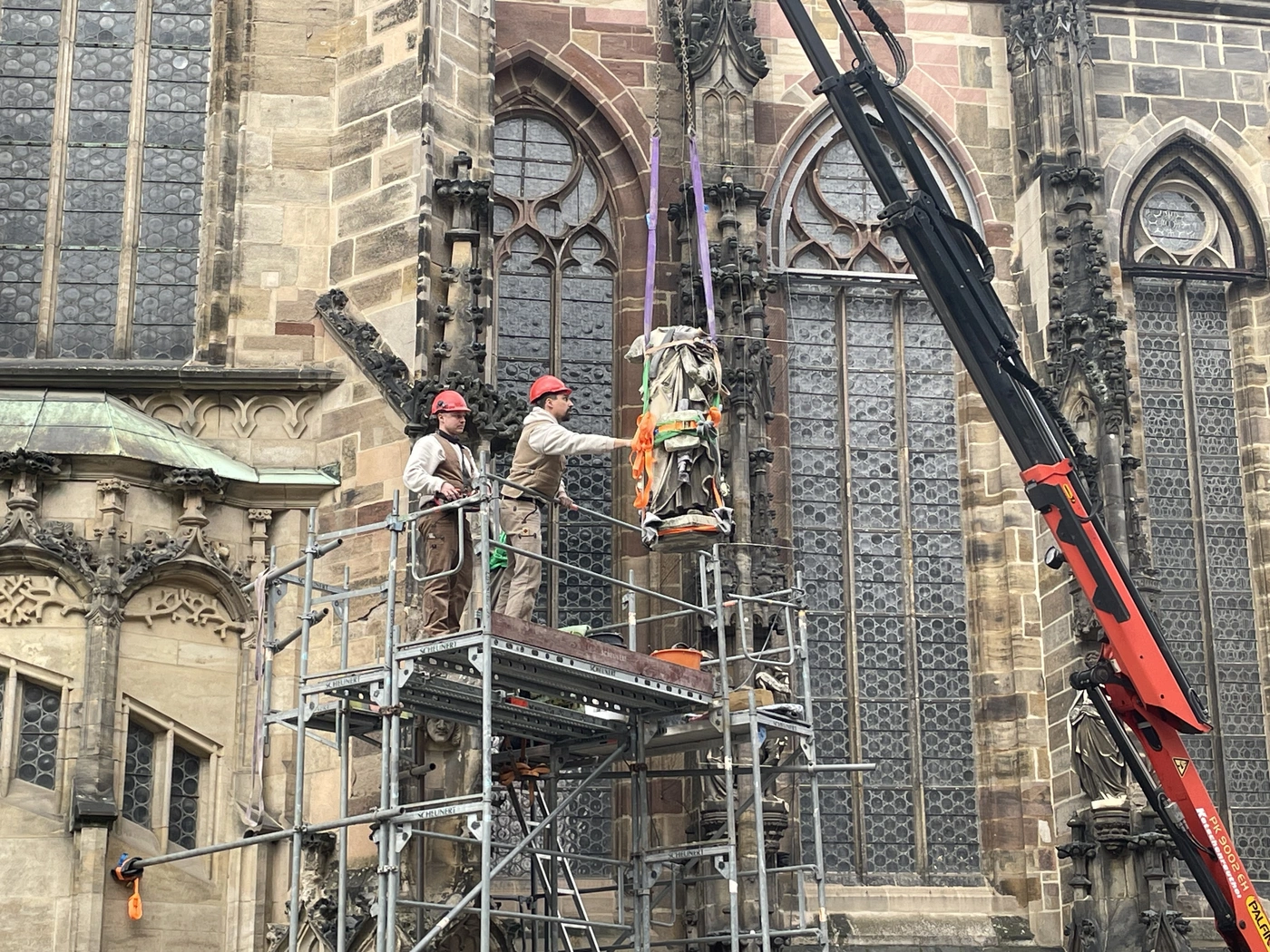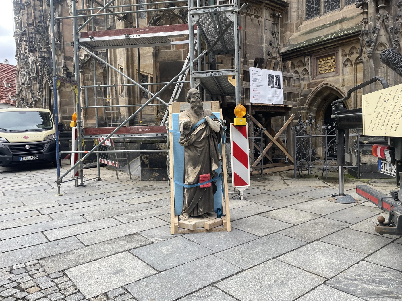 Mit 75 Statuen hat es am Zwickauer Dom begonnen - das war 1891. Bei einem Bombenangriff ging später die Figur des Heiligen Philippus verloren. Seit Dienstag fehlen drei weitere: Petrus, Paulus und Jesaja. Die Skulpturen wurden von ihrem Sockel gehoben und in die Werkstatt gebracht, um restauriert und konserviert zu werden.
