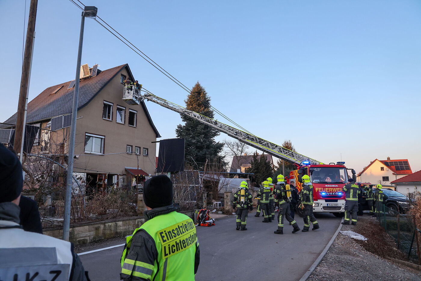 Feuerwehrleute fuhren die Drehleiter aus und schlugen eine Fensterscheibe im ersten Stock ein. Weil sie weißes Pulver entdeckten, wurde das LKA aus Dresden angefordert.