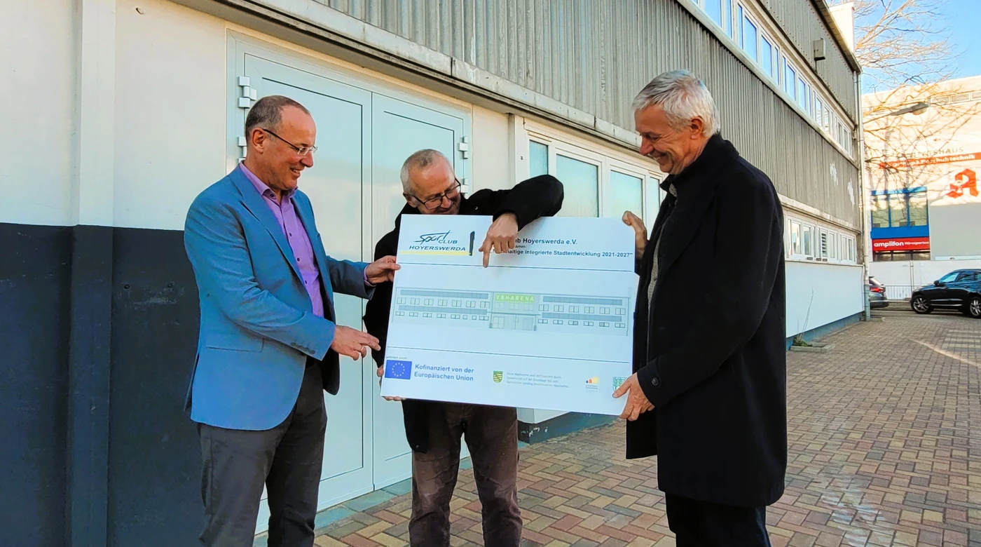 - Die VBH-Arena Hoyerswerda bekommt ein neues wärmedämmendes Kleid. v.l.n.r.: Steffen Markgraf, Geschäftsführer der Wohnungsgesellschaft Hoyerswerda, Chefplaner Bernd Kasper, Bauamtsleiter Dietmar Wolf