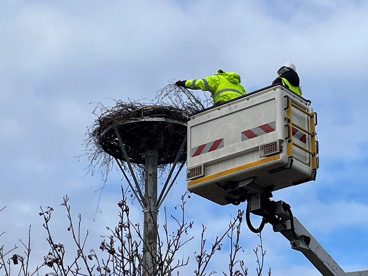 Der Versorger Sachsen Energie hat deshalb ein Nest aus dem vergangenen Jahr abgenommen. Damit die Störche dennoch zurückkehren können, wurde stattdessen daneben ein extra Mast mit Nisthilfe aufgestellt.