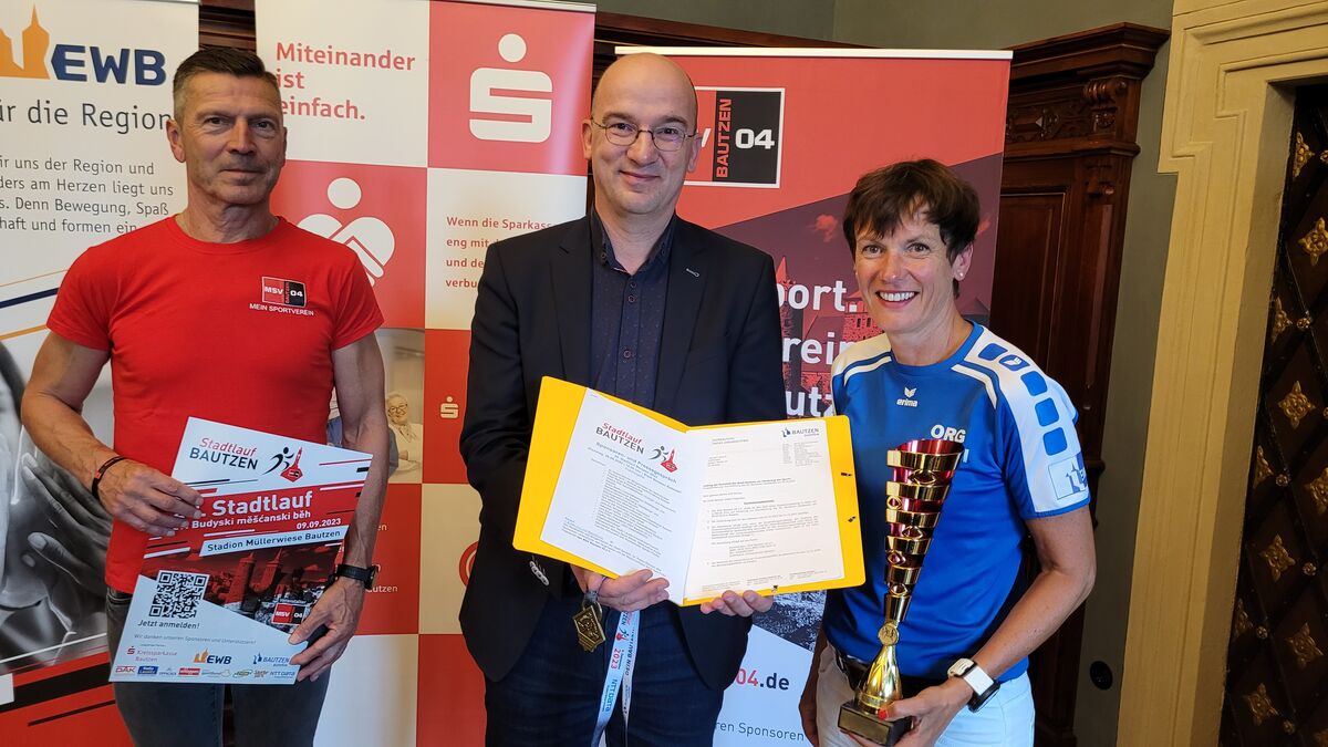 - Bautzen fördert den Stadtlauf in diesem Jahr mit 6.300 Euro. Bürgermeister Robert Böhmer (Bild Mitte) übergab den Scheck an Geschäftsführer Steffen Waldmann und Präsidentin Ines Pröhl vom MSV Bautzen 04.