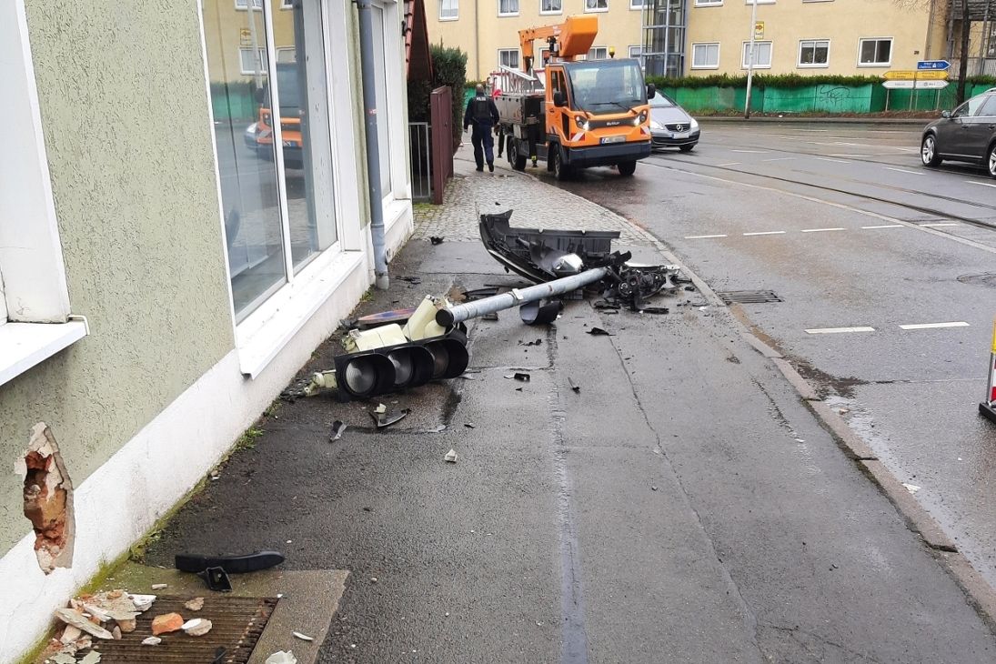 Ein Autofahrer hat die Fußgängerampel an der Kreuzung Talstraße/ Scheffelstraße rasiert. Wie die Polizei mitgeteilt hat, war der 81-Jährige am Donnerstagvormittag (10:50 Uhr) mit seinem Renault auf der Talstraße stadtauswärts unterwegs. Als er nach rechts auf die Scheffelstraße abbog, stieß er aus unbekannter Ursache gegen die Ampel. Dadurch wurde der Mast aus dem Boden gerissen, kippte um und beschädigte eine Hausfassade. Insgesamt entstand dabei ein Sachschaden von circa 12.000 Euro. Verletzt wurde glücklicherweise niemand.