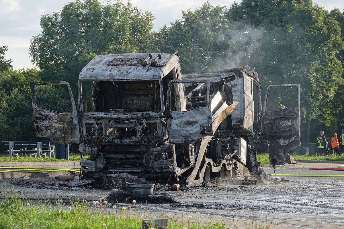 Als die Feuerwehr eintraf, stand der Anhänger mit den beiden nagelneuen LKW MAN lichterloh in Flammen. Mit zwei Strahlrohren konnten die Feuerwehrleute den Brand löschen. Trotz des schnellen Einsatzes war der Anhänger mitsamt teurer Fracht nicht mehr zu retten: Die LKW brannten komplett aus. Der Parkplatz war während der Löscharbeiten gesperrt. Die Polizei schätzt den entstandenen Sachschaden auf ca. 270.000 Euro. Als Ursache wird ein technischer Defekt in Betracht gezogen.