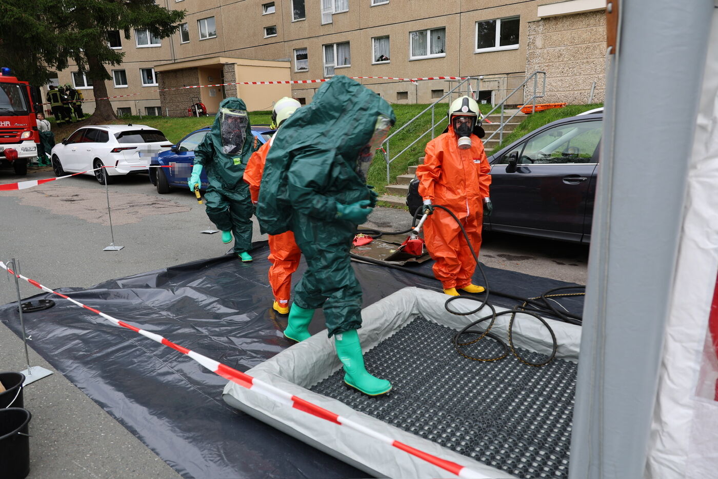 In Aue auf dem Eichert hat ein Großeinsatz von Feuerwehr, Rettungskräften und Polizei über Stunden für Aufregung gesorgt. Im Keller eines Wohnblocks an der Solinger Straße waren mehrere Liter hochgiftiges Brom ausgetreten. 52 Bewohner mussten laut Polizei in Sicherheit gebracht werden. 41 wurden vorsorglich vom Rettungsdienst untersucht, sechs kamen ins Krankenhaus.
