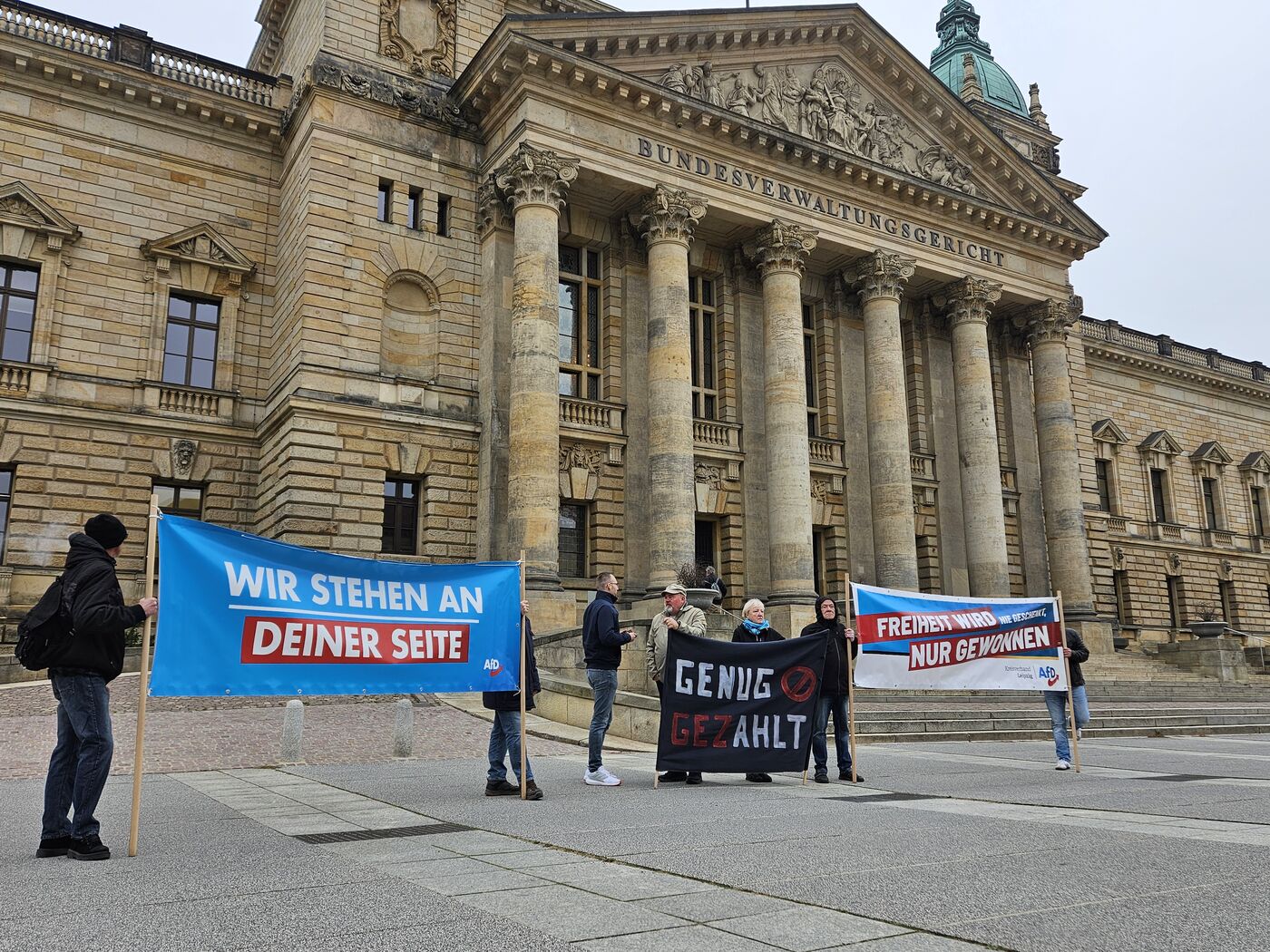 Ungewöhnlicher Protest am Mittwoch vor dem Leipziger Bundesverwaltungsgericht: Anhänger der AfD haben vor dem markanten Bau gegen die GEZ demonstriert. Hintergrund ist offenbar ein Prozess, der dort stattfindet.