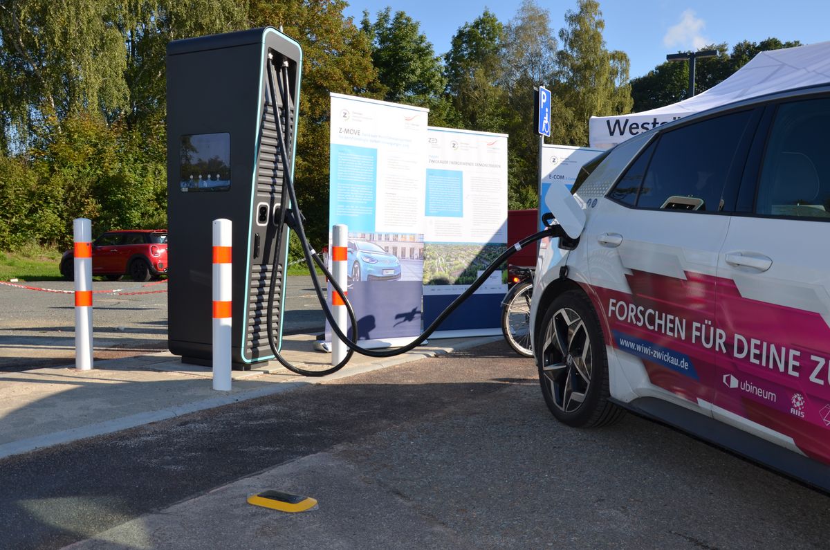 Beim Projekt „E-Com“ wurde am Donnerstag am Ubineum die Säule Nummer 28 übergeben. Sie ragt heraus – sie ist eine von zwei Schnellladesäulen, etwa so groß wie ein erwachsener Mensch und erhält als einzige den Strom von einem Batteriespeicher. Und sie steht im Zeitstrahl des Vorhabens etwa in der Mitte – in einem Jahr sollen es in Zwickau 54 Säulen sein, die in dem Rahmen aufgestellt wurden und betrieben werden. Das Projekt wird zu 100 Prozent gefördert.