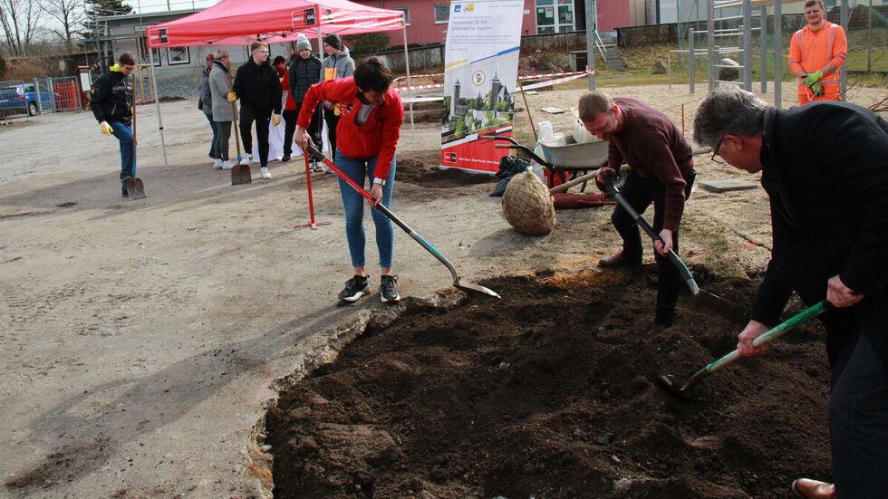 Schüler pflanzten die Bäume unter professioneller Anleitung. Die sechs Mädchen und Jungen lernen in dieser Woche das Berufsbild des Landschaftsgärtners kennen.