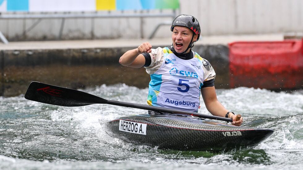 Die Olympia-Dritte Andrea Herzog hat bei der Kanuslalom-Weltmeisterschaft in Augsburg Gold gewonnen. Die Weltmeisterin von 2019 im Canadier setzte sich am Sonntag in einem Wildwasser-Krimi mit 0,92 Sekunden Vorsprung vor der australischen Ausnahme-Athletin Jessica Fox, die in Tokio Olympia-Gold im Canadier holte, durch. Trotz Problemen am Tor zwei und einer Torstabberührung am 14. Hindernis legte Herzog einen furiosen Endspurt hin und fuhr im unteren Bereich viel Zeit heraus. Dritte wurde die Britin Mallory Franklin.
