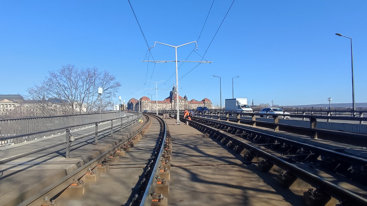 Die Arbeiten von den Dresdner Verkehrsbetrieben (DVB) auf der Carolabrücke kommen voran. Auf der Brücke werden momentan die Gleise und Fahrleitungen erneuert. Die Straßenbahnlinien 3 und 7 müssen daher Umleitungen fahren. Ab dem 17. März können die Bahnen dann aber wieder wie gewohnt auf ihrer Stammstrecke auf der Brücke unterwegs sein. Der Autoverkehr, Fußgänger und Radfahrer sind von den Reparaturarbeiten nicht betroffen.
