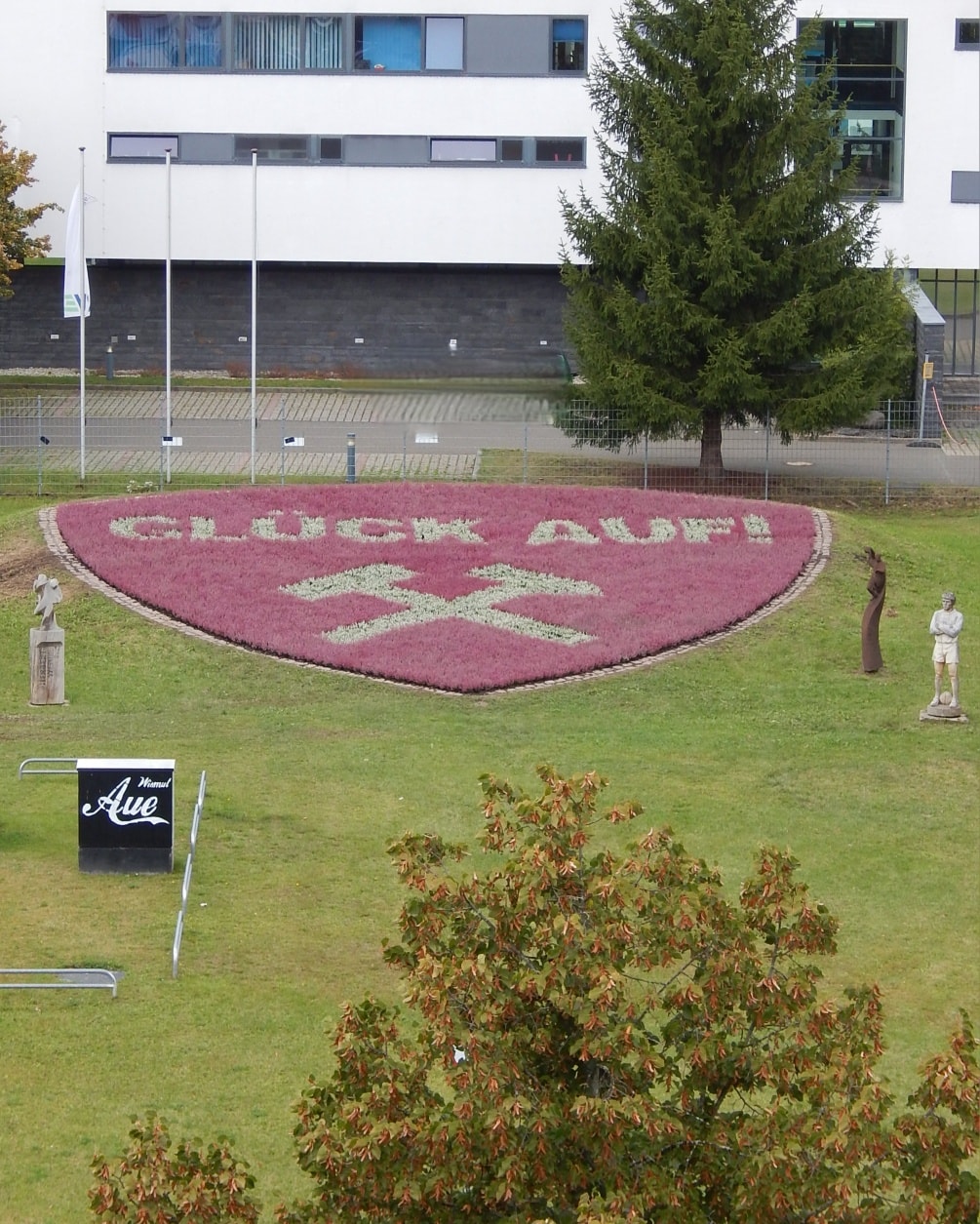In Aue, unterhalb der Bahnhofsbrücke, erstrahlt das Wismut-Wappen in frischer Herbstpracht. Insgesamt wurden 5.500 Pflanzen Besenheide gesetzt – 4.500 in Rot und 1.000 in Weiß.
