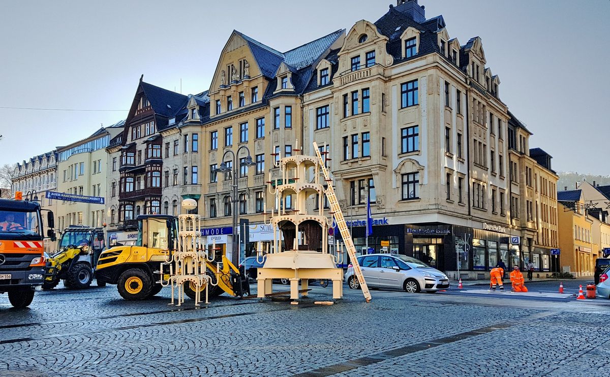 In Aue haben heute die Vorbereitungen für den Weihnachtsmarkt begonnen. Die Stadtpyramide wurde aufgebaut. Sie wird in der Weihnachtszeit auf dem Altmarkt ihre Runden drehen.