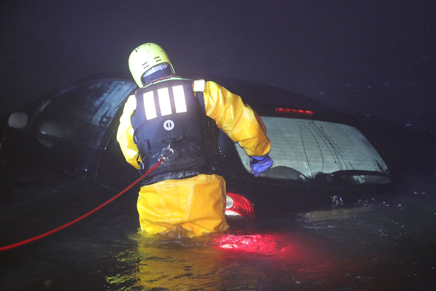 - Ein Feuerwehrmann sichert den Peugeot vor dem Abtreiben in der Elbe