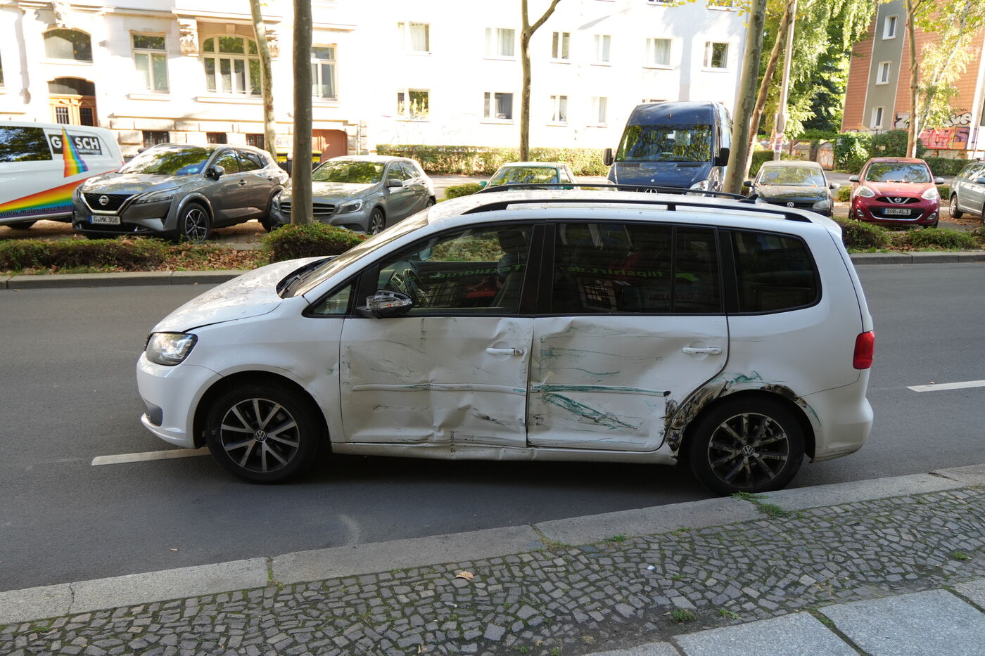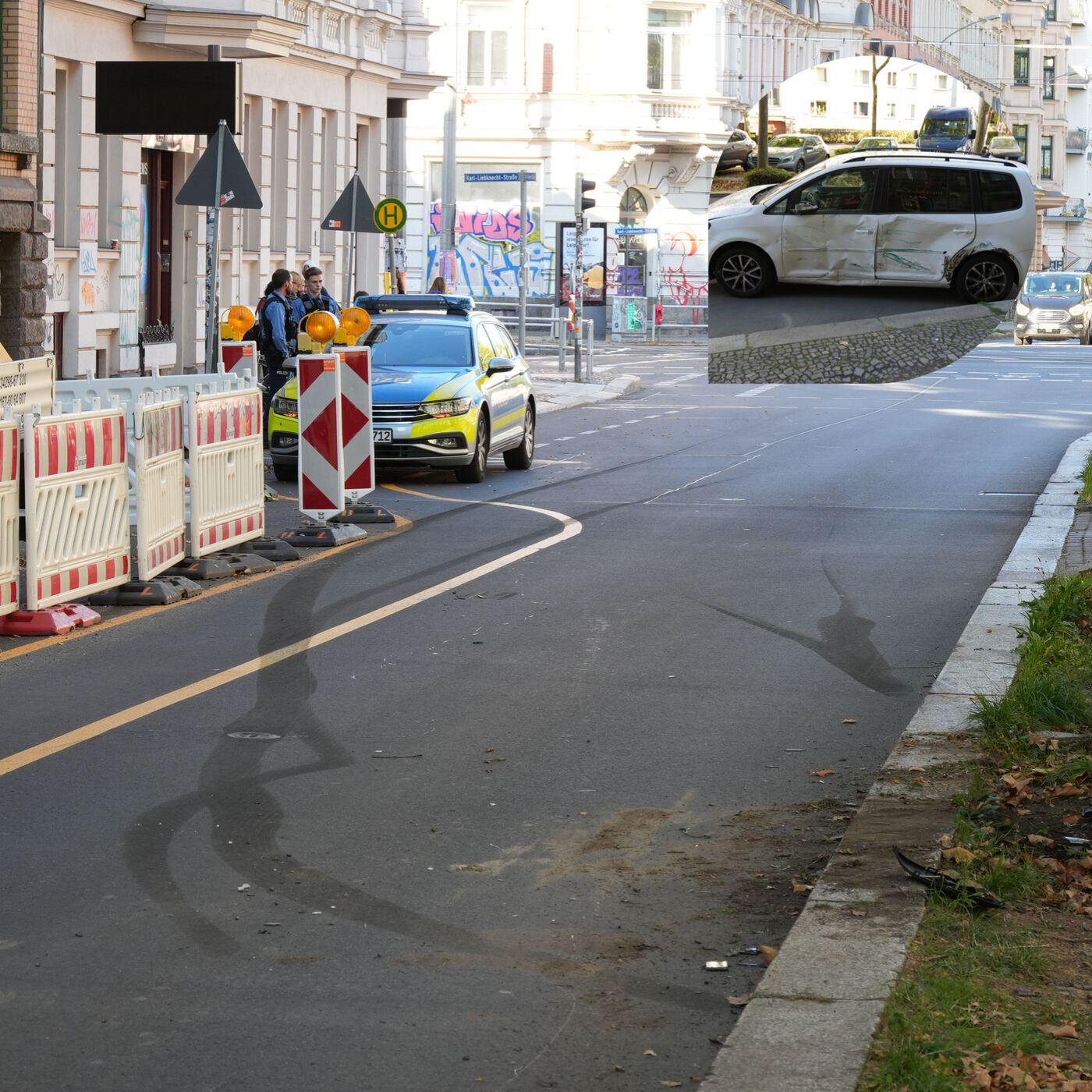 Die Unfallstelle auf der Kurt-Eisner-Straße und der schwer beschädigte VW Touran.