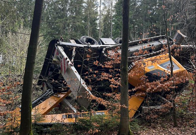 Geladen hatte er einen Bagger, der vom Anhänger in die Böschung rutschte, wo er auf dem Dach zum Liegen kam. Der 38-jährige Lkw-Fahrer blieb unverletzt.
