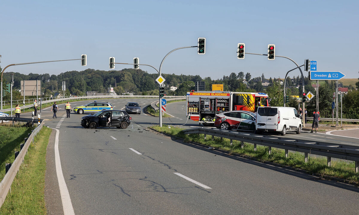 Bei einem Unfall mit mehreren Fahrzeugen sind am Donnerstagmorgen auf der B 175 in Glauchau zwei Menschen verletzt worden. Eine 57-Jährige war nach Polizeiangaben an der Kreuzung zur A4-Anschlussstelle Glauchau-Ost über die rote Ampel gefahren und ist mit einem Tesla zusammengestoßen. Dabei wurde die Frau schwer verletzt. Der Tesla geriet durch die Wucht des Aufpralls auf die Gegenfahrbahn und ist dort mit einem Transporter zusammengekracht. Dabei wurde der 37-jährige Tesla-Fahrer leicht verletzt.