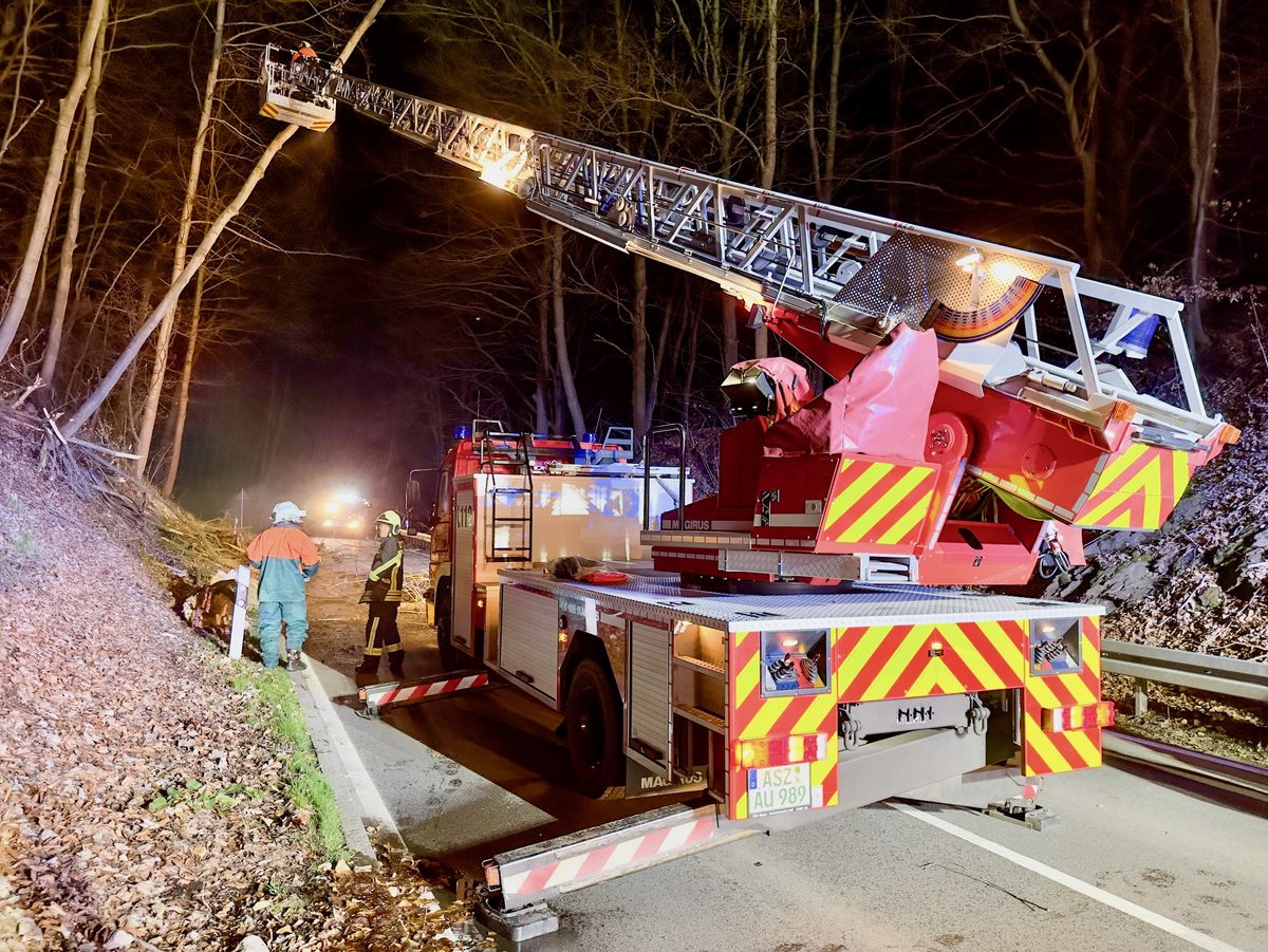 Die Feuerwehr musste um Mitternacht auf der Auer Talstraße in Bad Schlema anrücken. Ein Baum lag quer über der Straße, mehrere andere Bäume drohten von einem Hang abzurutschen. Deshalb wurde die Drehleiter aus Aue zur Verstärkung gerufen. So konnte ein Baum von der Baumkrone aus Stück für Stück abgetragen werden. Weitere wurden mit einer Seilwinde vom Hang gezogen.