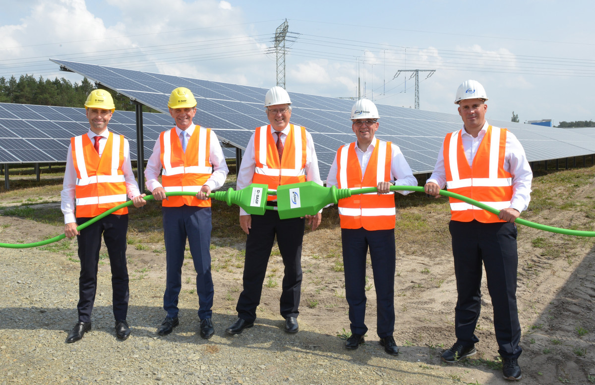 V.l.: Dr. Robert Preusche (Co-Geschäftsführer BASF enviaM Solarpark Schwarzheide GmbH), Jürgen Fuchs (Vorsitzender der Geschäftsführung der BASF Schwarzheide GmbH), Prof. Dr.-Ing. Förg Steinbach (Minister für Wirtschaft, Arbeit und Energie Brandenburg), Dr. Stephan Lowis (Vorstandsvorsitzender der enviaM AG) und Thomas Kühnert (co-Geschäftsführer der BASF enviaM Schwarzheide GmbH).