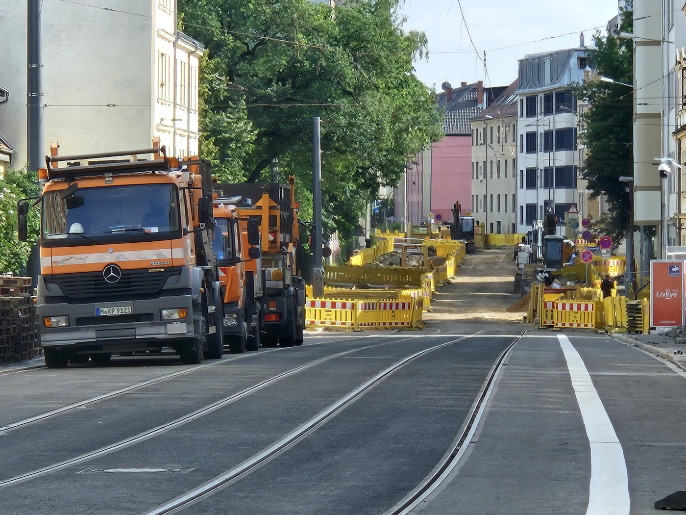Ursprünglich sollten Fahrzeuge und Straßenbahnen den Abschnitt ab Dezember wieder befahren können. Daraus wird nun nichts. Neuer (voraussichtlicher) Termin für die Fertigstellung der Arbeiten: Mitte März 2026. „Die Gleisarbeiten erstrecken sich damit in die kalte Jahreszeit, in der wetterbedingte Zeitpuffer einzuplanen sind“, so ein Stadtsprecher.