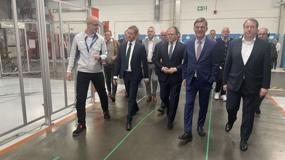 Ministerpräsident Michael Kretschmer: Mosel hat eine Zukunft (links von ihm Umweltminister Carsten Schneider, rechts Thomas Edig, Personalchef VW Sachsen