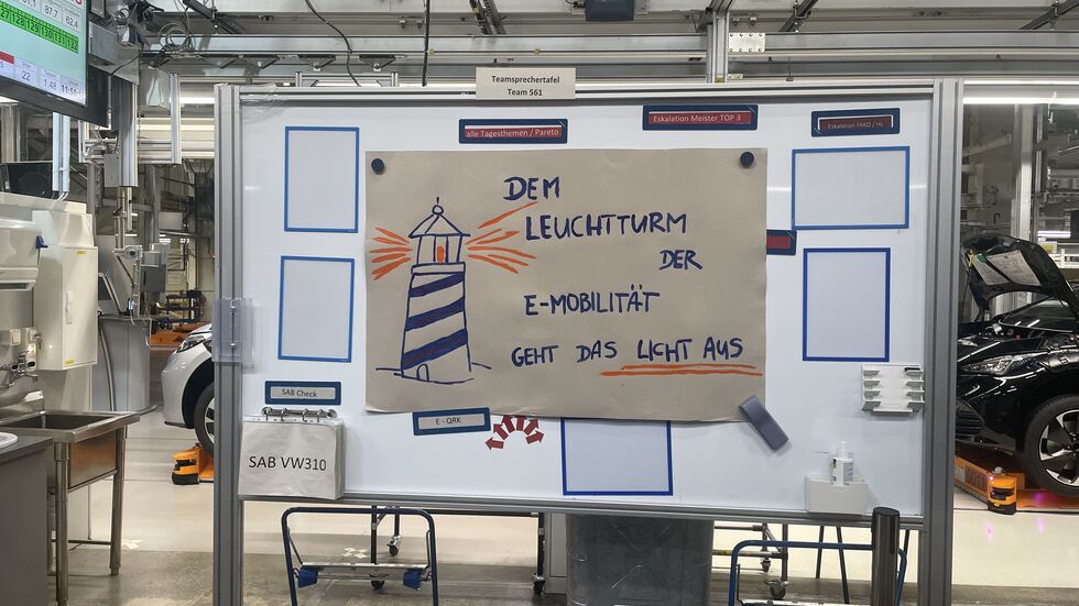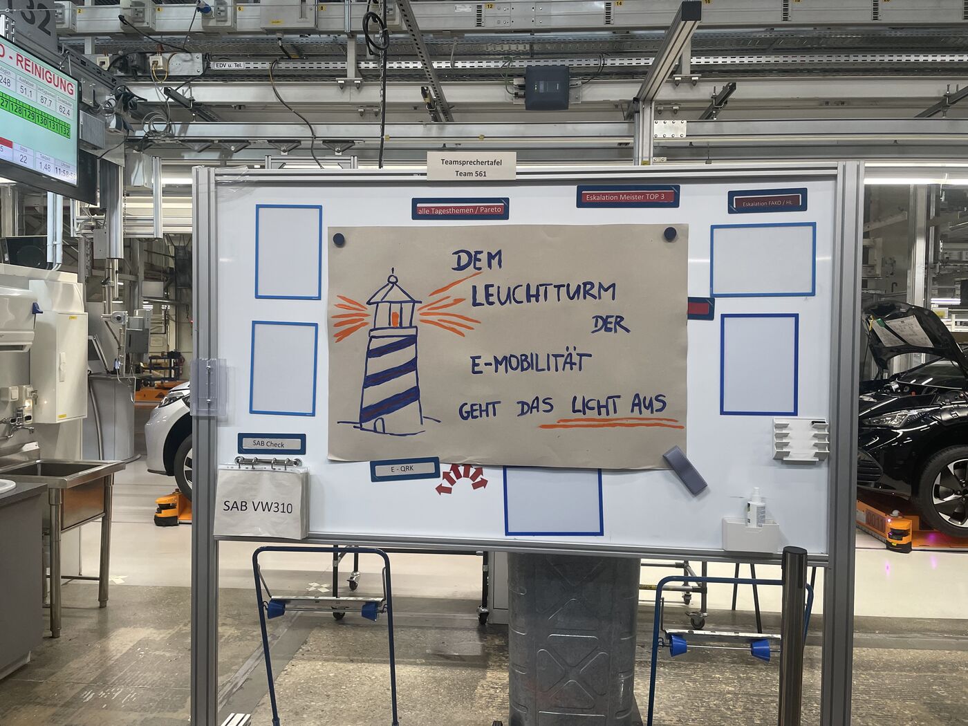 „Dem Leuchtturm der E-Mobilität geht das Licht aus“ – das war am Montagmittag an der Sprechertafel vom Team 561 zu lesen. Gegenüber gaben in der Fertigungshalle von VW ein Manager und Spitzenpolitiker ihre Statements ab. Nach dem Medientermin konnte man ein Stück optimistischer sein, dass die VW-Lampen in Zwickau-Mosel noch länger leuchten, dass der Standort eine Zukunft hat.