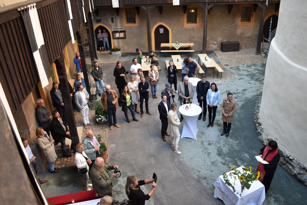 Der Aussichtsturm der Burg Schönfels ist am Wochenende eingesegnet worden. Bei der offiziellen Dankesfeier waren alle Akteure eingeladen, die an der Sanierung des Bergfrieds seit dem Frühjahr 2021 beteiligt gewesen sind. Pfarrerin Gabriele Sander führte den symbolischen Akt durch. Der Turm hat einen neuen Dachstuhl bekommen und wurde frisch verputzt. Seit den Sommerferien können Besucher ihn wieder besteigen und in 26 Metern Höhe die Aussicht genießen.
