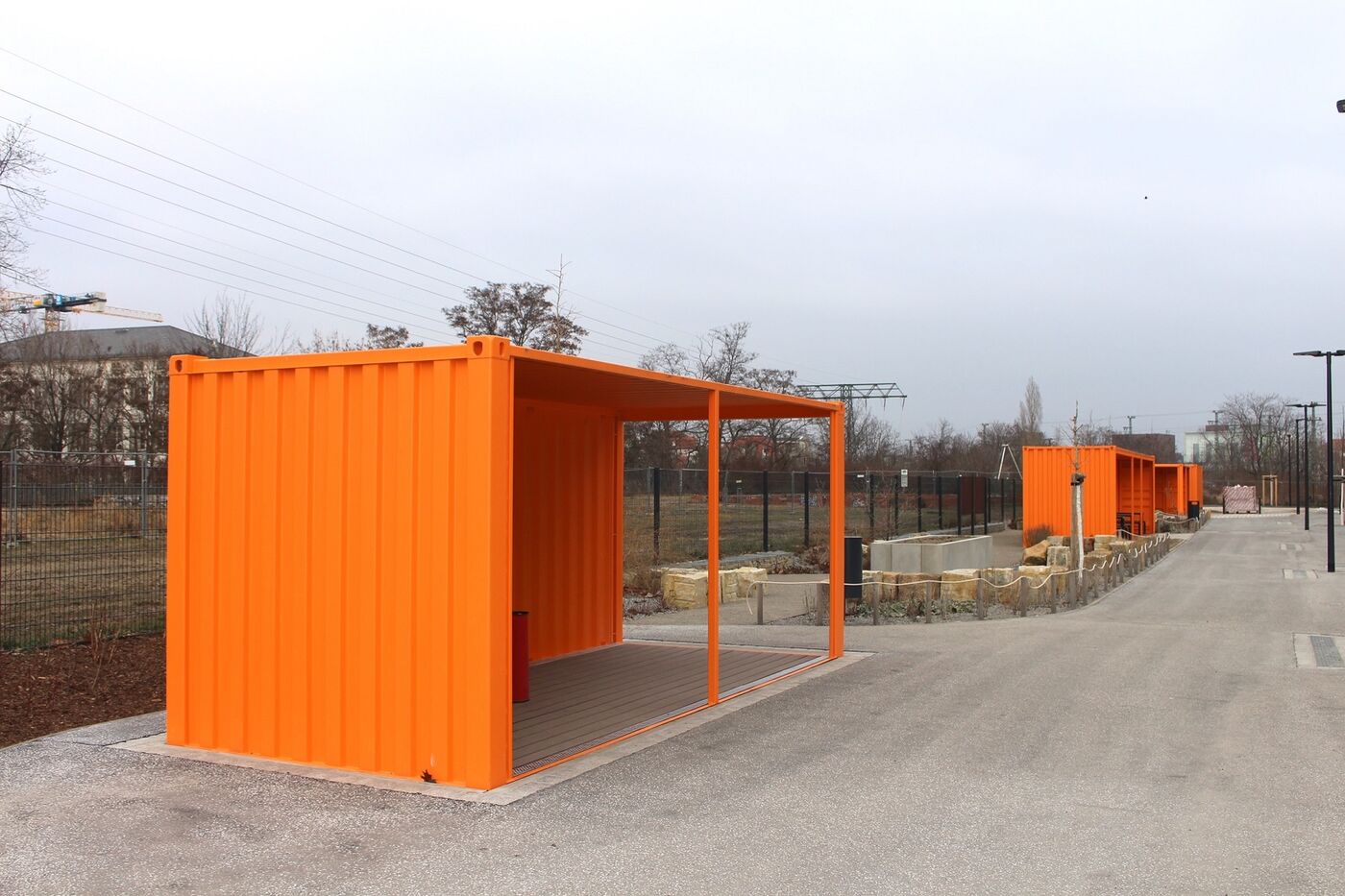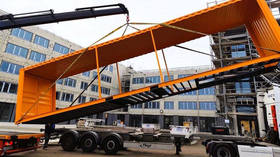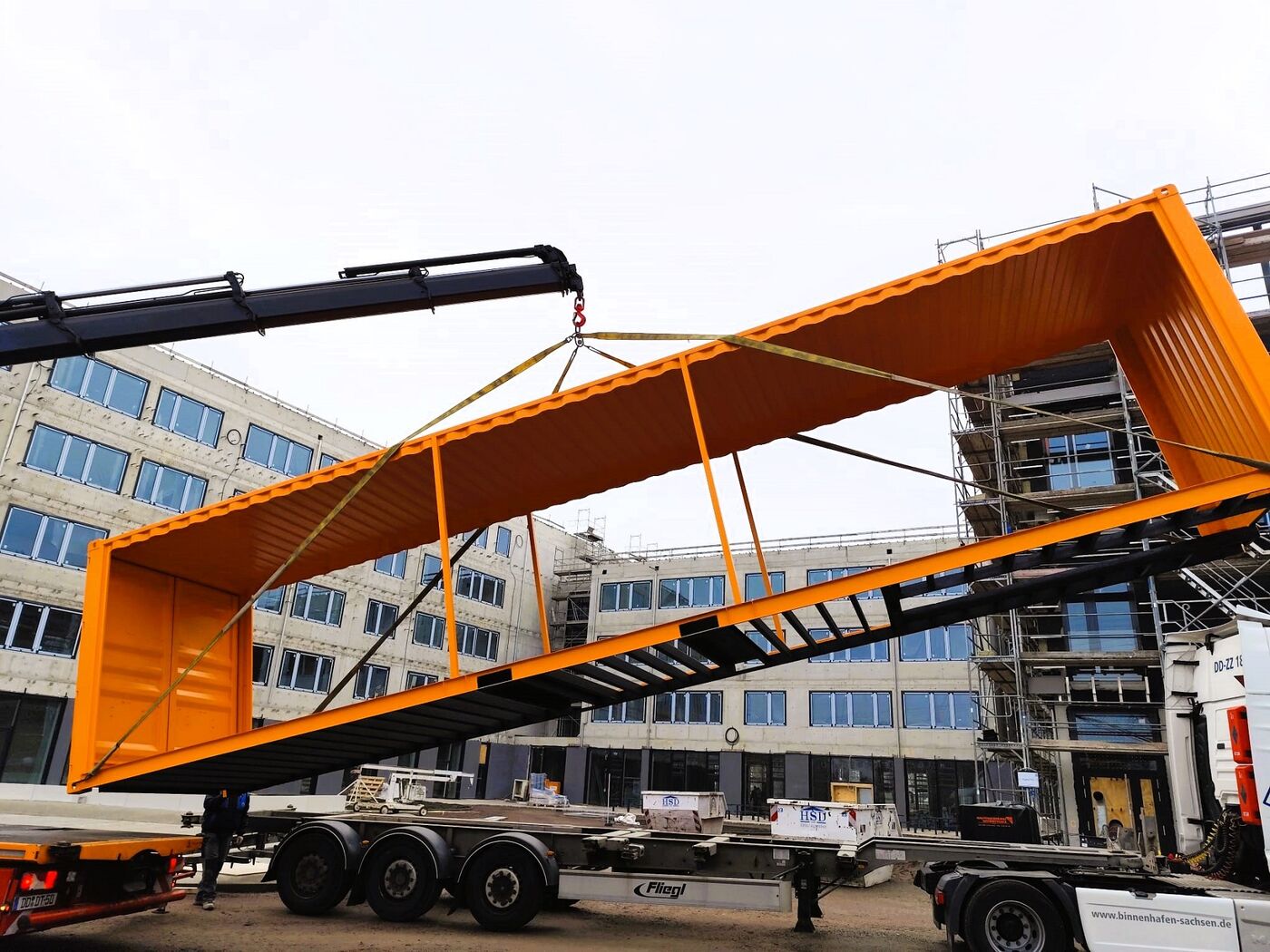 Alle Container wurden passend zum Erscheinungsbild des BSZ in einem markanten Orangeton lackiert und fügen sich damit optisch in das Schulgelände ein. Der komplette Umbau erfolgte im SBO-Hafen Riesa. Anschließend wurden die Container zum Zielort in Dresden transportiert und mithilfe eines Ladekrans aufgestellt.