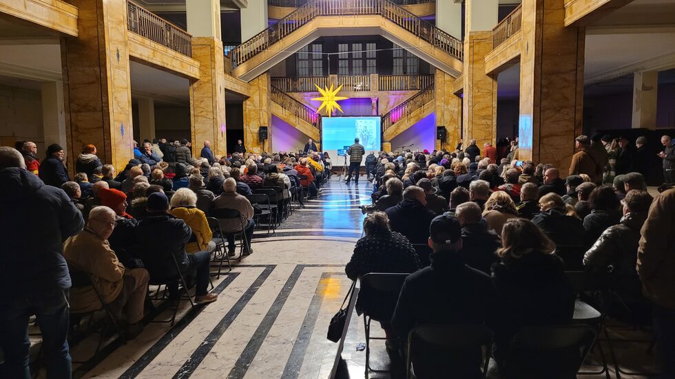 Kaufhaus-Besitzer Winfried Stöcker hatte sein Haus für eine Fotoausstellung geöffnet. Titel: 80 Jahre Frieden. Gezeigt wurden Bildern von russischen und deutschen Fotografen aus der Zeit vom Ende des Zweiten Weltkrieges. Als bekannt wurde, dass der angekündigte Künstler Uwe Steimle nicht kam, verließen einige enttäuscht das Haus.