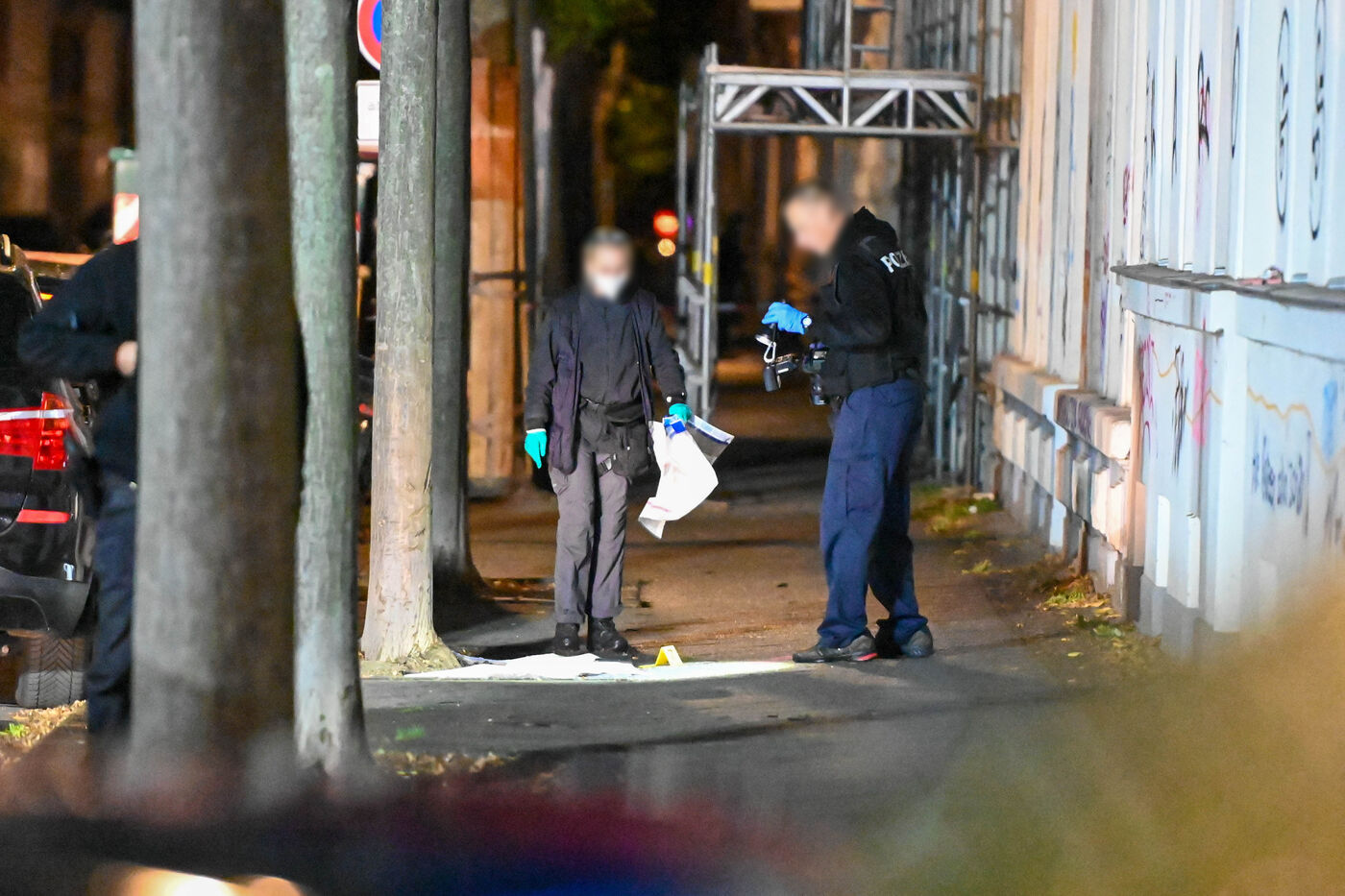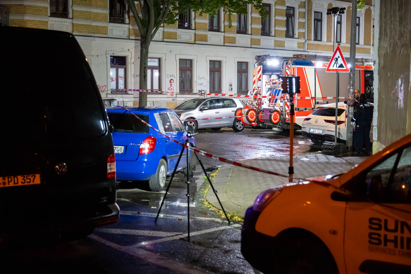 Polizisten bei der Spurensicherung auf der Mariannenstraße in Leipzig.