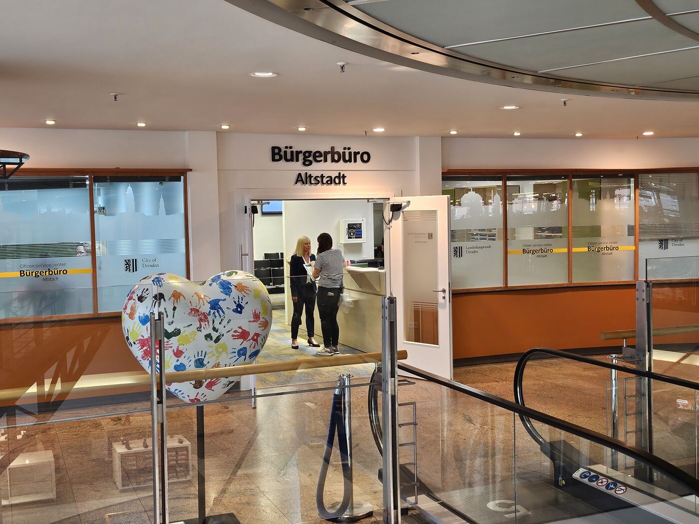Der Zugang ist je nach Uhrzeit unterschiedlich geregelt: Zwischen 9 und 10 Uhr ist das Kaufhaus noch geschlossen. Bürgerinnen und Bürger mit vereinbartem Termin gelangen über den Seiteneingang auf der Prager Straße 12, neben dem Dynamo-Fanshop, ins Bürgerbüro. Von dort führt ein Aufzug direkt in die 5. Etage. Der Zugang ist vor Ort ausgeschildert. Ab 10 Uhr gelangen die Bürgerinnen und Bürger über die großen Haupteingänge ins Gebäude.