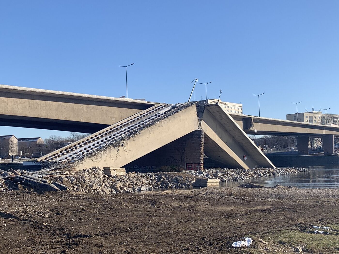 Baubürgermeister Stephan Kühn informierte am Dienstagmittag darüber, dass das Schall-Monitoring, mit dem der Zustand der noch stehenden Brückenteile permanent überwacht wird, Aktivitäten angezeigt hat. Demzufolge gibt es Brüche im Spannstahl am mittleren Pfeiler der Brückenzüge A und B. Die waren nicht direkt von dem Einsturz im Herbst 2024 betroffen.