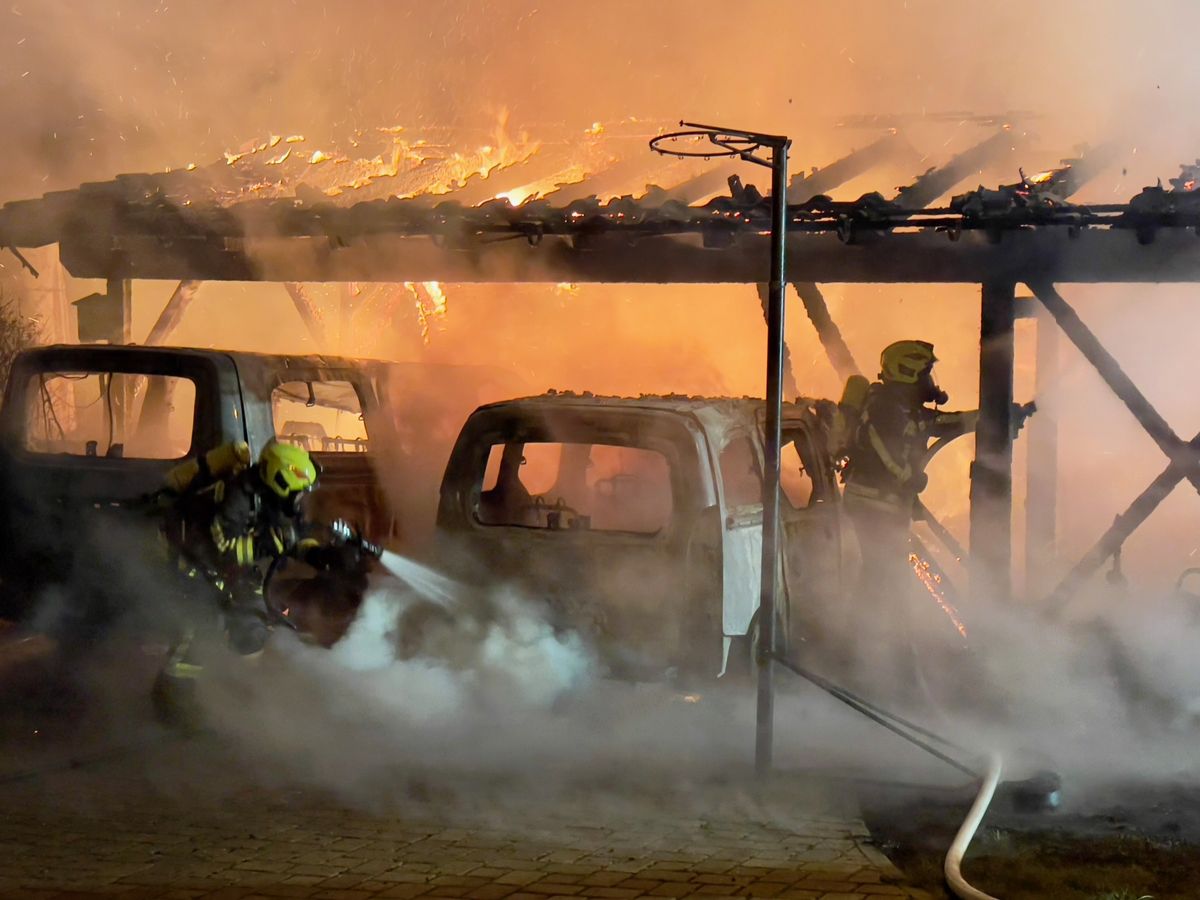 Der Carport sowie die darin untergestellten Fahrzeuge brannten Samstagmorgen völlig aus.