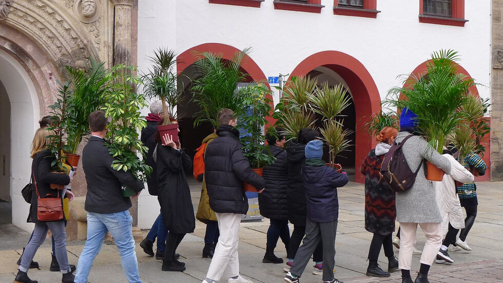 Chemnitzer spazieren mit Zimmerpflanzen im Arm durch die City