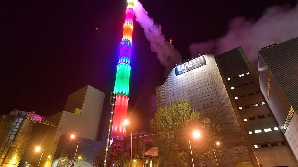 Ab Donnerstag wird der bunte Schornstein nachts nicht mehr beleuchtet. Das hat der Energieversorger „eins“ mitgeteilt, der damit die von der Bundesregierung beschlossene Verordnung zur Sicherung der Energieversorgung umsetzt.