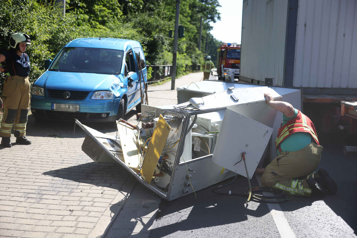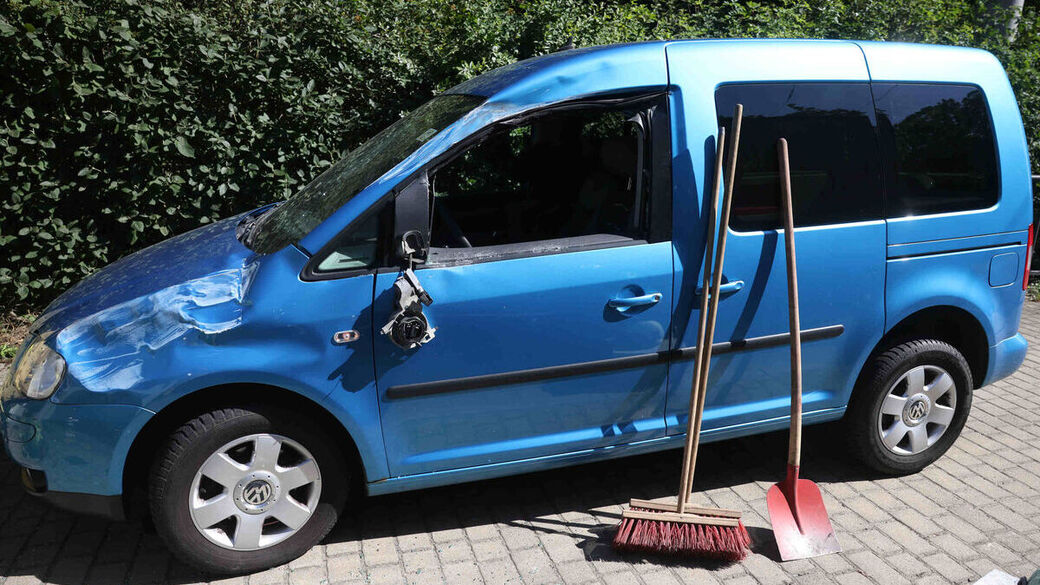 Die Seite des VW wurde deutlich beschädigt. Die Feuerwehr zerlegte den zwei Tonnen schweren Container und räumte ihn beiseite. Dafür musste die Straße zeitweise gesperrt werden, es kam zu Verkehrseinschränkungen. Die Polizei ermittelt.
