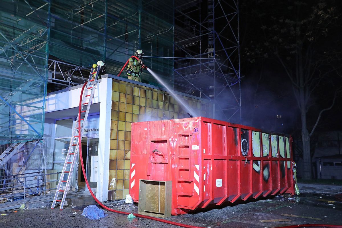 Demnach wurden die Kameraden am späten Montagabend wegen eines Containerbrandes alarmiert. Mehrere Anrufer meldeten zudem ein Übergreifen der Flammen auf ein Wohnhaus. Die Löscharbeiten wurden zunächst vom Dach des Hauseinganges durchgeführt, daraufhin entleerten die Einsatzkräfte den Bauschuttcontainer und löschten das Brandgut. Dabei wurde eine Feuerwehrfrau leicht verletzt. Außerdem kühlte die Feuerwehr die Fassade des Hauses, um eine weitere Ausbreitung zu verhindern.