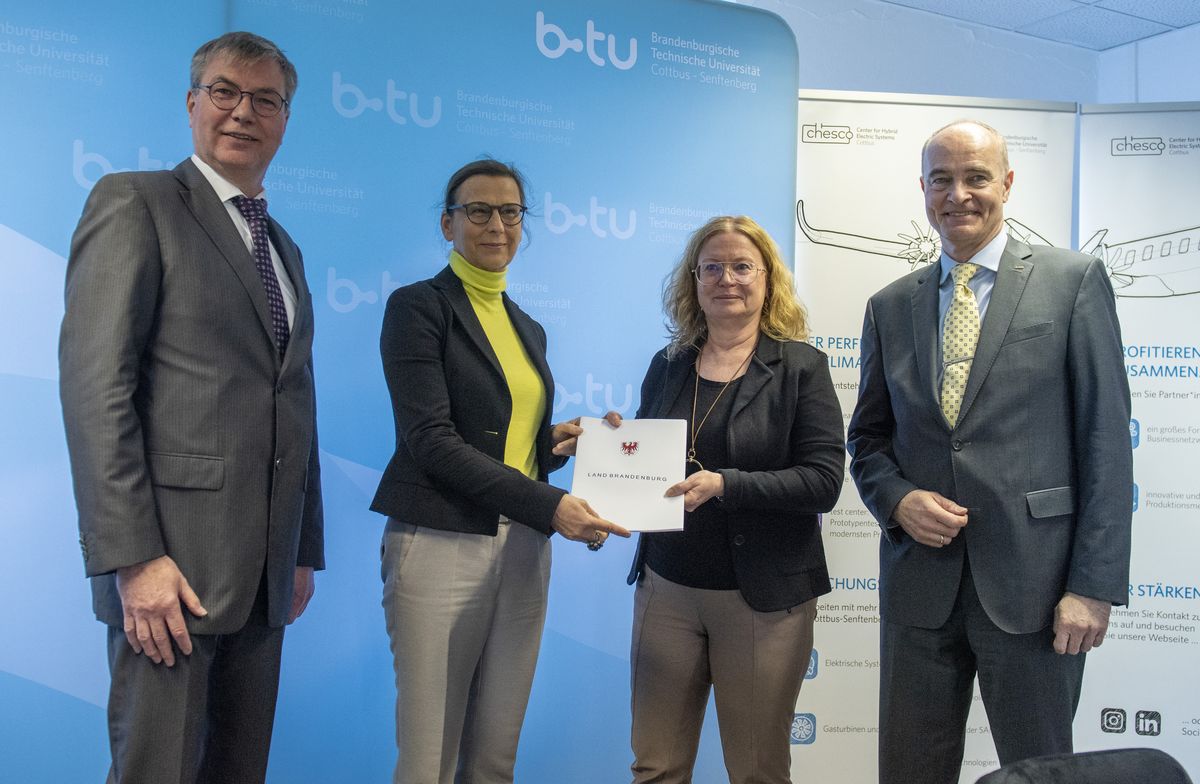 Übergabe des Bewilligungsbescheides (v.l.n.r.): Prof. Dr.-Ing. Georg Möhlenkamp, BTU-Präsidentin Prof. Dr. Gesine Grande, Staatssekretärin Dr. Friederike Haase und Prof. Dr.-Ing. Klaus Höschler.