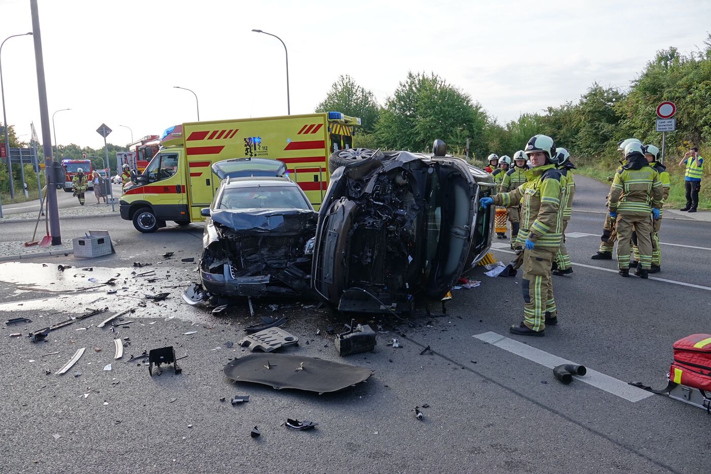 Die Berufsfeuerwehr (Wache Altstadt) und die Stadtteilfeuerwehr Kaitz sicherten die Unfallstelle ab und nahmen die ausgetretenen Betriebsstoffe auf. 36 Kräft waren vor Ort. Der Verkehrsunfalldienst der Polizei ermittelt zur Unfallursache.