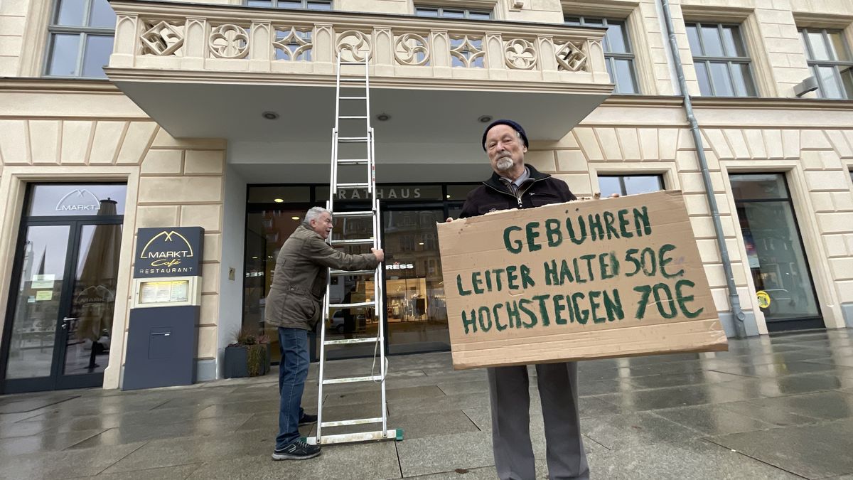 Der Zwickauer Grünen-Stadtrat Martin Böttger und Nachwende-Ordnungsamtschef Karl-Ernst Müller (beide Jahrgang 1947) haben dagegen protestiert, dass das Verfahren gegen die FDJ eingestellt wurde. Bei einer Spontandemo am Mittwochnachmittag legten sie symbolisch eine Leiter am Rathaus an.