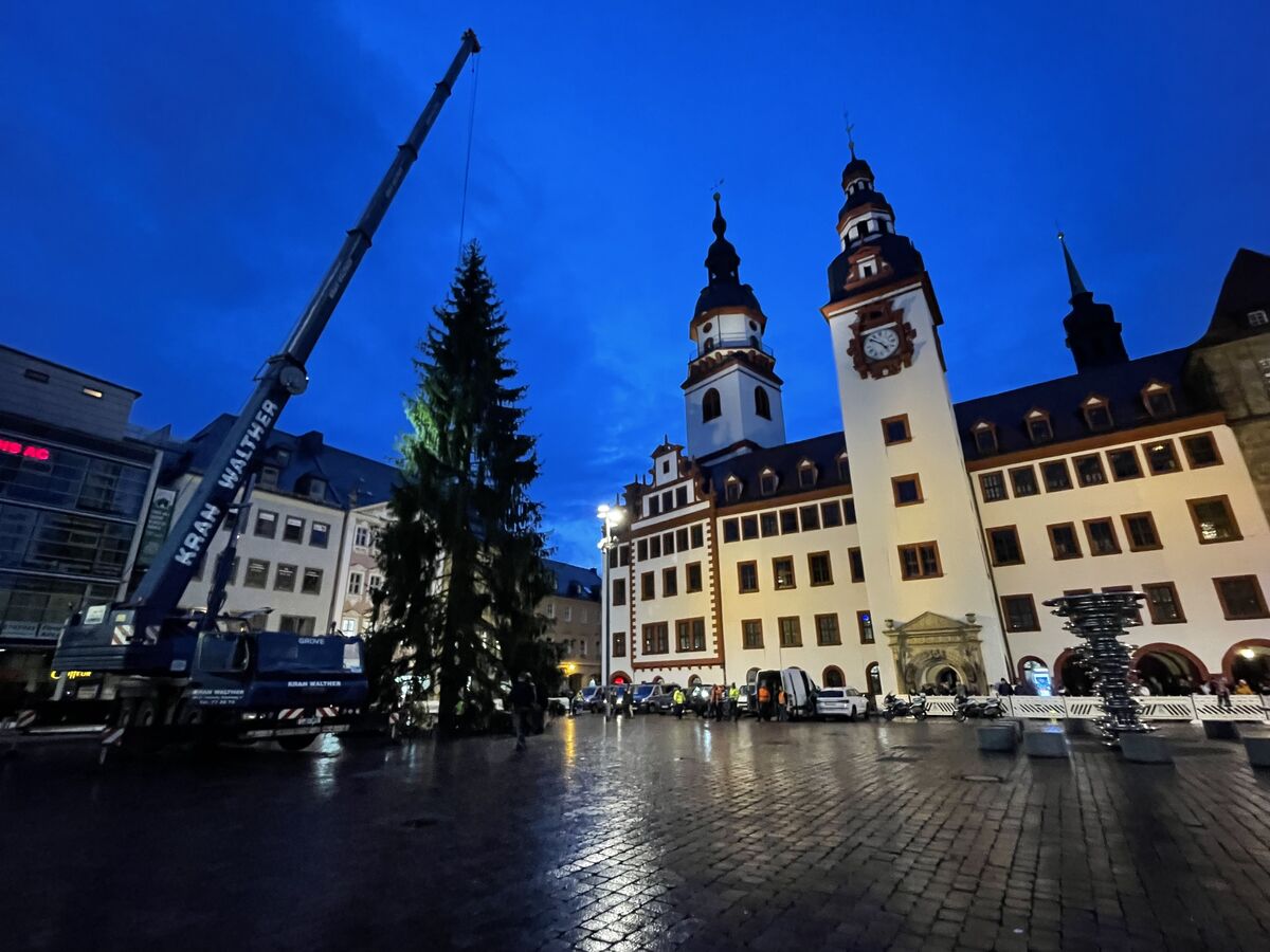 Hunderte Chemnitzer haben am Samstagnachmittag auf dem Markt die Ankunft des Weihnachtsbaumes gefeiert. Gegen 16 Uhr bog der Tieflader mit dem Baum auf die Innere Klosterstraße ein und fuhr dann zum Markt, wo er mit einem Kran aufgestellt wurde. Die rund 27 Meter hohe Fichte war am Vormittag in Tannenbergstal, im Vogtland gefällt worden. Durch das Aufstellen hat sie noch einmal etwa 2 Meter an Höhe verloren, sodass der Baum den Markt nun mit rund 25 Metern überragt. Am Montag kommt die Beleuchtung. Der Chemnitzer Weihnachtsmarkt eröffnet am 1. Dezember.