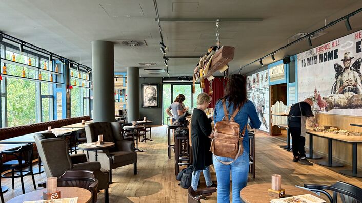 Der Schauspieler selbst wollte eigentlich bei der Eröffnung dabei sein, musste seinen Besuch jedoch kurzfristig absagen, da sein Manager einen Unfall hatte. Trotzdem standen Hunderte von Fans Schlange. Kein Wunder! Das neue Restaurant sorgt für den ultimativen Nostalgiefaktor: Es ist in Saloon-Optik eingerichtet. Außerdem gibt es originale Requisiten und zahlreiche Fotos von Terence Hill zu bestaunen.