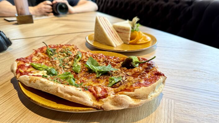 Die Speisekarte dürfte den einen oder anderen überraschen: Terence Hill, der sächsische Wurzeln hat, ist selbst Vegetarier. Deshalb ist die Küche komplett fleischfrei. Der Vielfalt tut das jedoch keinen Abbruch. Es gibt Pastagerichte, Burger, Pizza oder das Lieblingsgericht des 86-Jährigen: Marmeladentoast mit Mandelmus für 8,50 Euro. Und natürlich dürfen auch Bohnen und Speck nicht fehlen – allerdings in einer vegetarischen Variante.