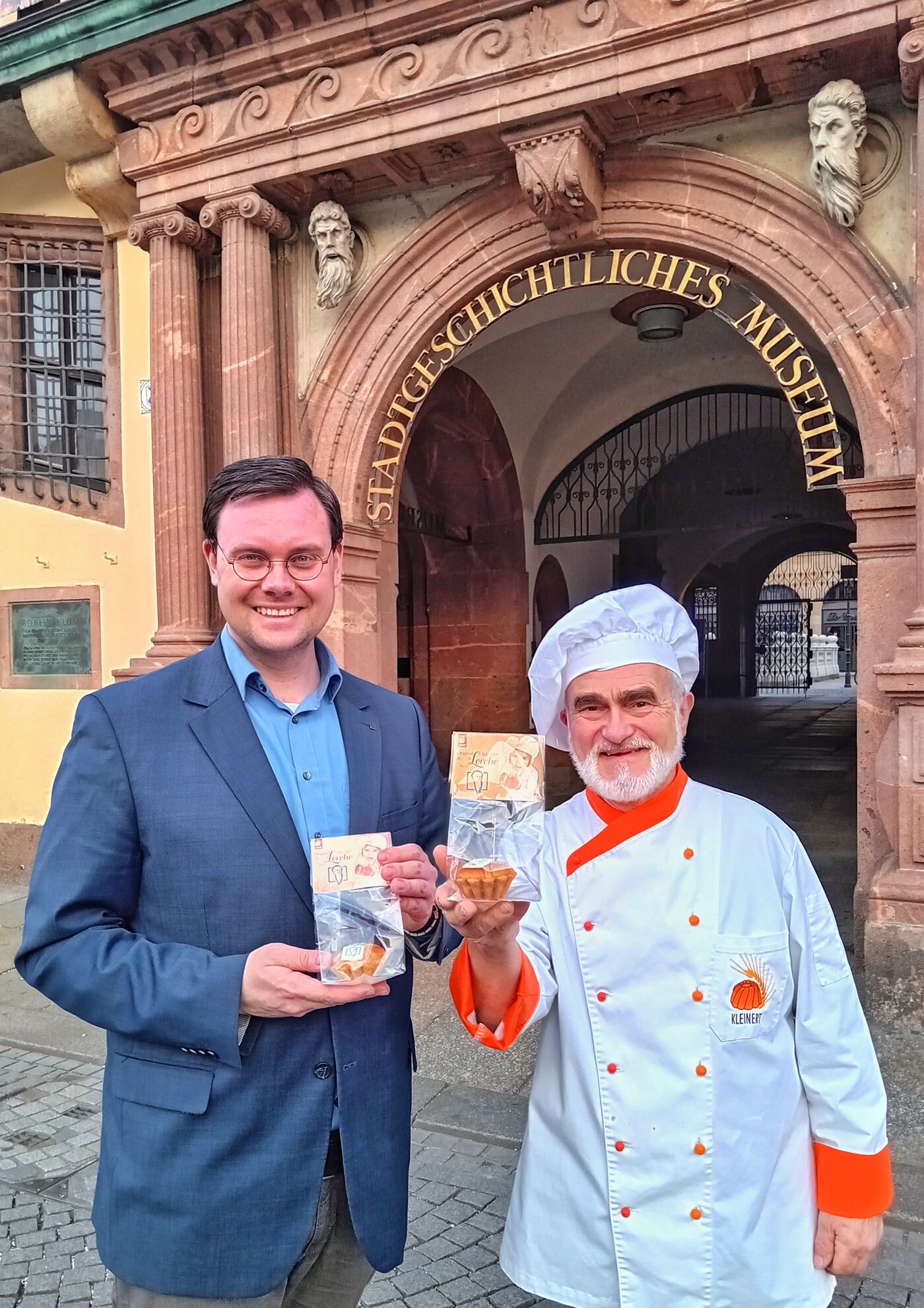 - Mit den neuen Lerchen: Eric Buchmann, Vorsitzender der Lotter Gesellschaft, und der Leipziger Konditormeister Jürgen Kleinert.