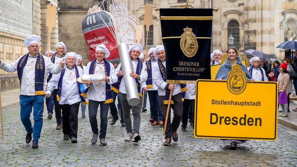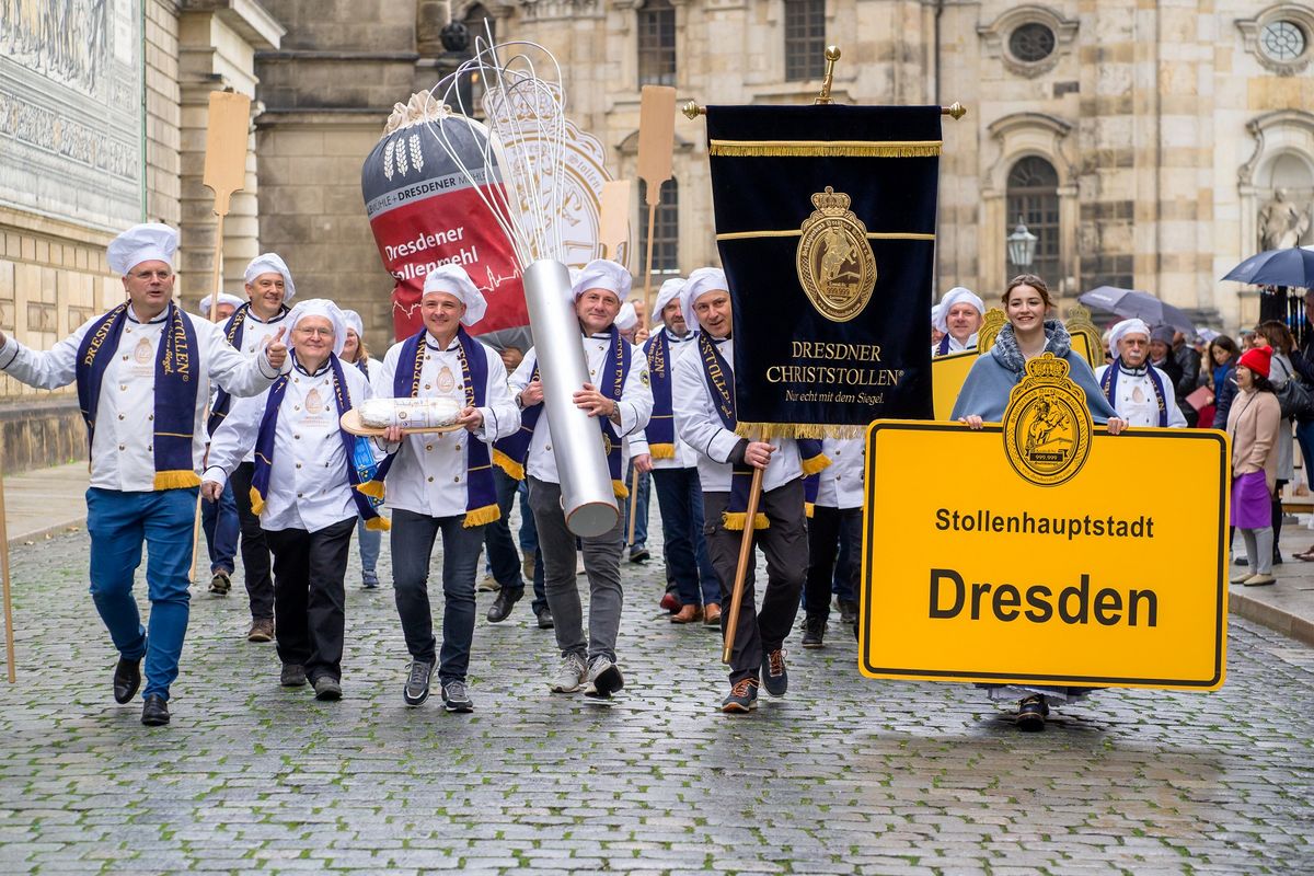 Die Stollensaison in Dresden ist offiziell eröffnet! Am Mittwoch gab der Schutzverband Dresdner Stollen offiziell den Startschuss, diesmal mit einem „Stollenbäckerzug“ am „Fürstenzug“.