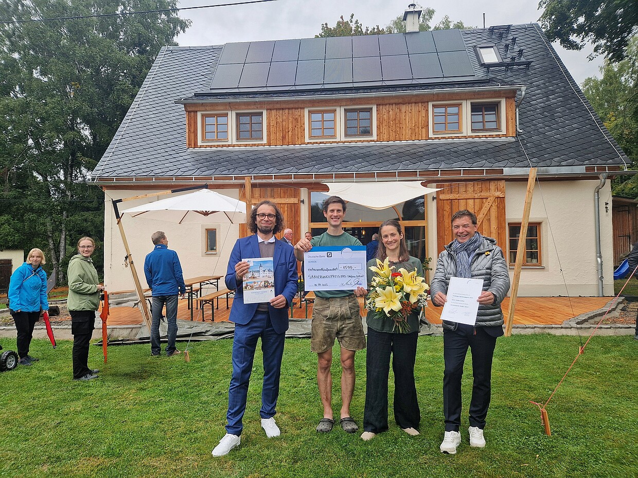 Glückwunsch zum Sanierungspreis 2025: Bürgermeister Martin Seltmann (l.) und Torsten Wenzel (r.), Filialdirektor Deutsche Bank, überreichen das Preisgeld an die Bauherren Stefan Leitner und Lilly Koppatsch.