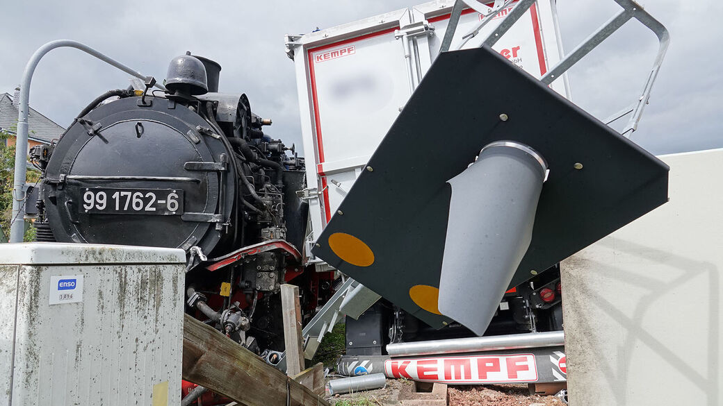 Die Dampflok entgleiste. Der LKW riss auch noch ein Trafohäuschen sowie eine Straßenlampe um.