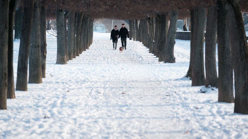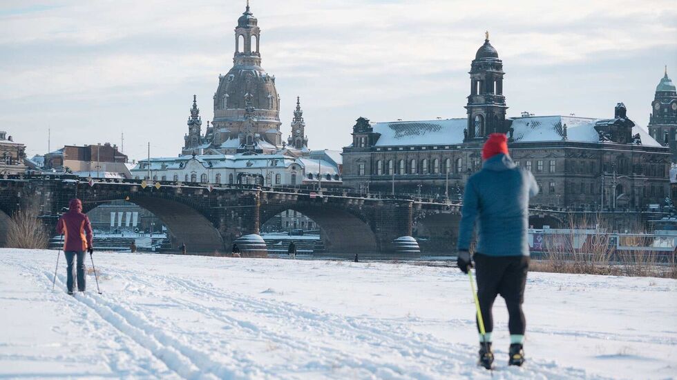 Was für eine Traumkulisse für Skifahrer! Reichlich Neuschnee hat auch die Elbwiesen vor Dresdens historischer Altstadt weiß gefärbt.