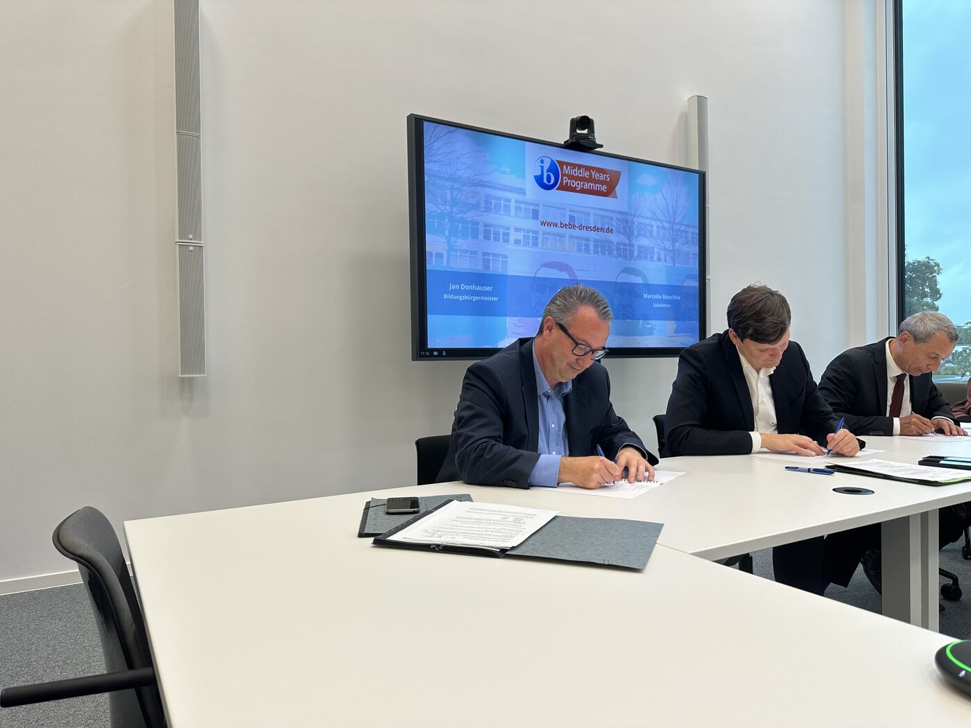 Bildungsbürgermeister Jan Donhauser (l.), Kultusminister Conrad Clemens (M.) und BeBe-Schulleiter Marcello Meschke bei der Unterzeichnung der Absichtserklärung.