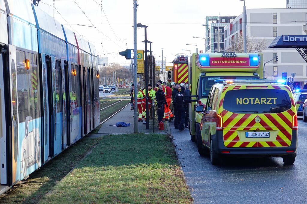 Der Mann hatte die einfahrende Straßenbahn wohl übersehen. Die Grunaer Straße wurde zunächst gesperrt, mehrere Straßenbahnen mussten umgeleitet werden.