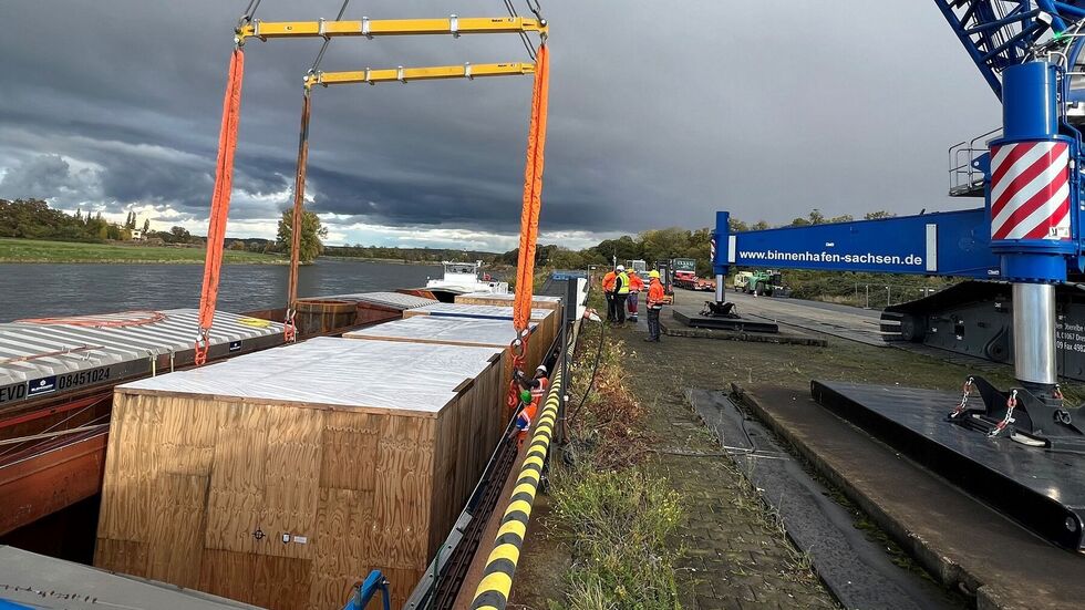 Nach fünf Monaten Niedrigwasser kommt in den Dresdner Alberthafen Bewegung. In den vergangenen Tagen konnten endlich wieder Schiffe beladen werden, teilten die Sächsischen Binnenhäfen Oberelbe mit.