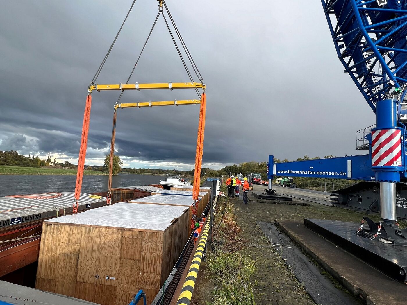 Zwei Schubverbände wurden mit Rotoren, Transformatoren und Kühlern bestückt. Die insgesamt 900 Tonnen schwere Fracht wurde Richtung Hamburg, Antwerpen und Dorsten in Nordrhein-Westfalen verschifft. Aufgrund der positiven Pegelprognosen sollen bis Ende des Monates weitere Trafos im Dresdner Hafen verladen werden.
